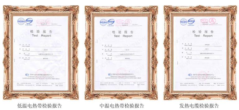 為了保證檢驗報告的權威性,時效性,針對性。我司電熱帶,發熱電纜產品選擇國家最權威的檢測機構-國家電線電纜質量檢測中心進行送檢。經過三四個月的檢驗周期,目前我司已重新獲得低中溫自控溫電熱帶,發熱電纜國家電線電纜檢驗報告。所以產品質量均達到或優于檢測標準,這是對我司近期生產的產品質量,包括原材料采購一重要評定。我司將陸續更新現有公司資質,做到與時俱進。