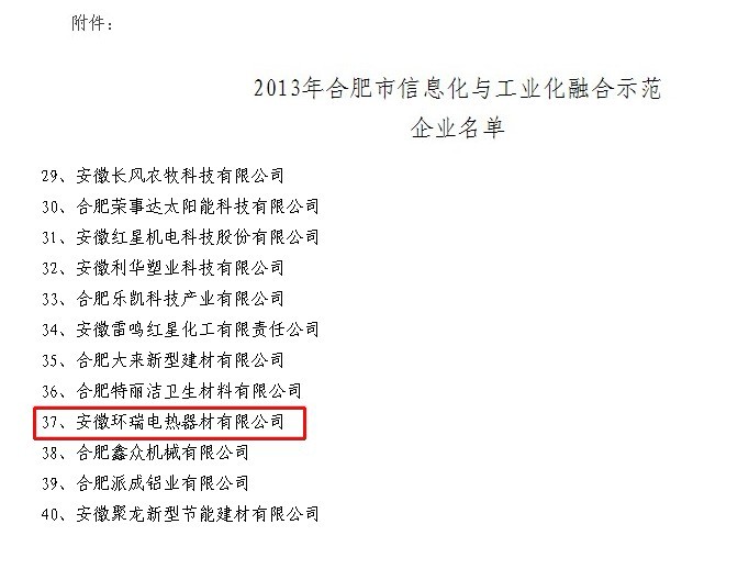為加快推進我市兩化深度融合,發揮典型示范作用,依據《合肥市信息化與工業化融合示范企業認定管理辦法(試行)》和《合肥市第三方企業信息化公共服務平臺認定辦法(試行)》等文件,經企業申報、縣區推薦、專家評審和綜合審查,現確定安徽環瑞電熱器材有限公司,等40家為2013年合肥市     安徽環瑞將積極響應政府的有關倡導:不斷提升自身信息化應用水平,切實發揮示范企業帶動作用,認真總結信息化建設經驗,積極探索利用信息技術推動產業升級轉型,發展新型業務模式,培育新業態,走出一條合肥特色的信息化與工業化深度融合的“科技環瑞”的發展道路,促進電伴熱帶,發熱電纜產業結構優化升級,最終為振奮合肥的經濟,做出貢獻!