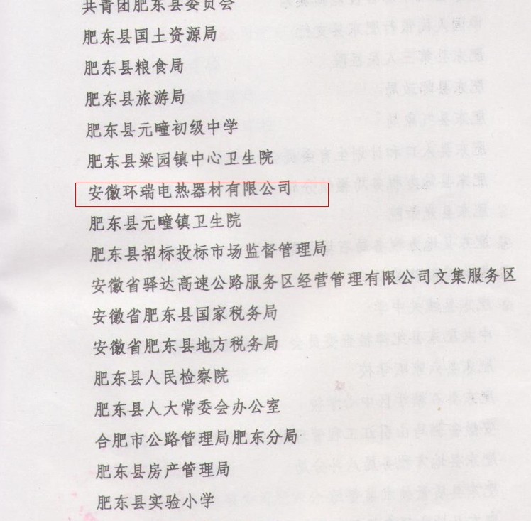 安徽環瑞電熱器材有限公司有幸成為其中的一員,我們將再接再厲,發揚成績,為推進社會主義物資文明,政治文明,精神文明和生態文明建設,構建和諧社會的偉大實踐中更好的發揮示范帶頭作用。做出新的更大的貢獻。提供思想保障,精神動力和智力支持。