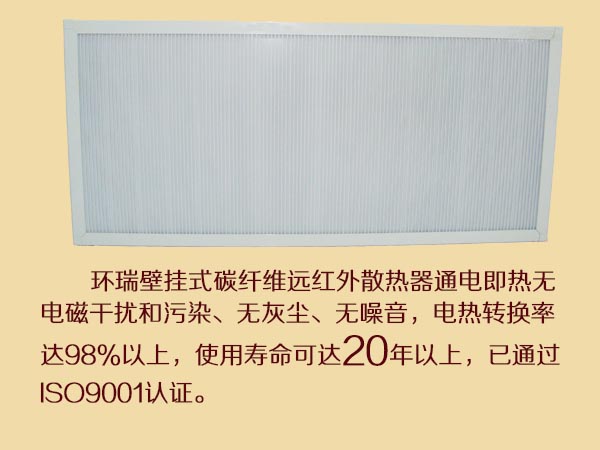 環瑞壁掛式碳纖維電暖器是采用先進技術研制開發的一種新型電采暖的專利產品。采用高科技長絲碳纖維材料制成,具有性能穩定,安全可靠,環保節電,經濟實用等特點。屬于國家認定的綠色環保電加熱產品。