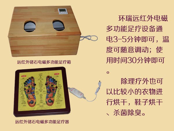環瑞遠紅外鍺石電磁多功能足療器遠紅外鍺石電磁多功能足療箱突破了以往足療器采用電動脈沖等原理,讓人們足底有震動感就能理療的假象。環瑞暖腳設備通電后產生17um的遠紅外光波穿過人體真皮組織對足部各個穴位進行效的輻射,促進人體的新陳代謝氣血運行、調節內臟功能、舒通全身經絡,從而達到祛病驅邪、益氣化瘀、滋補元氣的目的經達以按摩治療的效果。