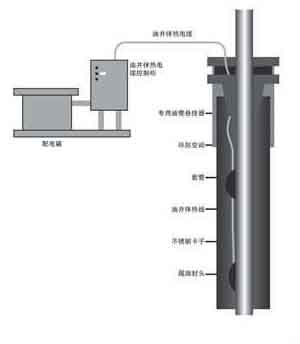 鳩茲自控溫油井拌熱電纜電加熱裝置,是自控溫油井拌熱電纜通電后、沿管線方向,隨著井深的溫度梯度逆向自動調整輸出功率。通過油管外壁向油管內供熱,沿線向維持一定恒溫,以達到降粘、解錯、增加泵效之效果。其核心是伴熱電纜內三組PTC發熱芯帶是由導電高分子聚合物PTC功能材料,經擠出輻射加工制成,每一點皆能隨被加熱體系溫度的變化其輸出功率逆向隨之變化,以達到自動補償、自動調整、自動控制之功效。