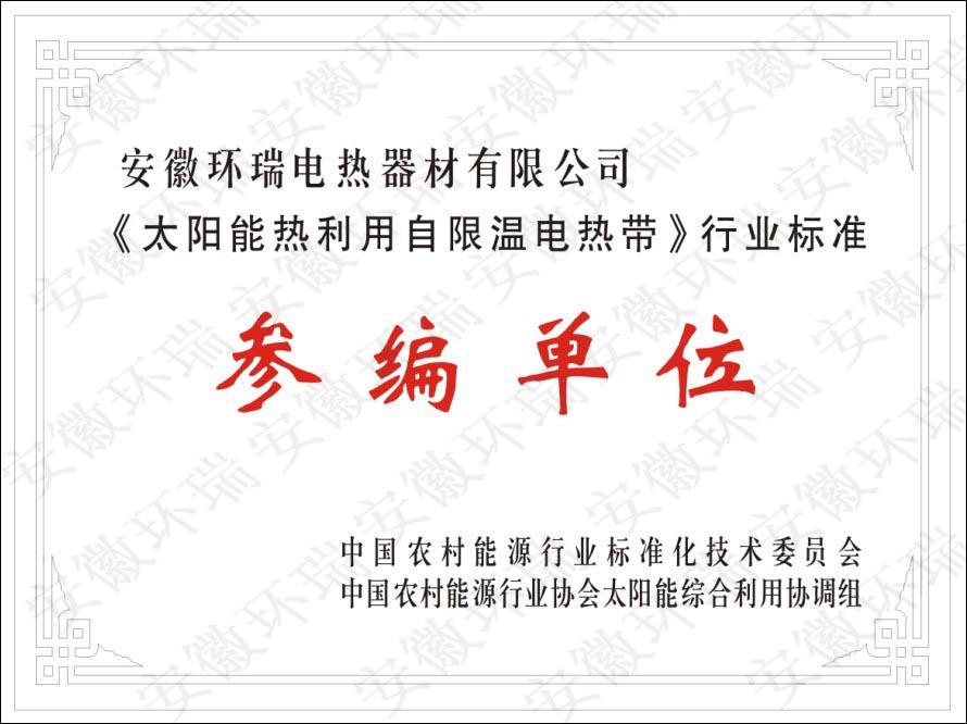 安徽環瑞電熱器材有限公司長期致力于自限溫電伴熱帶在各行業的應用,尤其是太陽能專用自限溫電伴熱帶,并研發出一種安全節能的太陽能電伴熱帶-納米阻燃本質安全型電熱帶,獲得了國家專利證書和省高新技術產品,針對目前國內層次不齊的電熱帶質量,為了規范太陽能電熱帶的市場,提高產品的質量。安徽環瑞與多家電伴熱同行企業共同起草《太陽能熱利用自限溫電熱帶》,此標準由中國農村能源行業協會提出。能源行業農村能源標準化技術委員會歸口,是專門針對太陽能行業的自限溫電熱帶標準,具有重要意義。